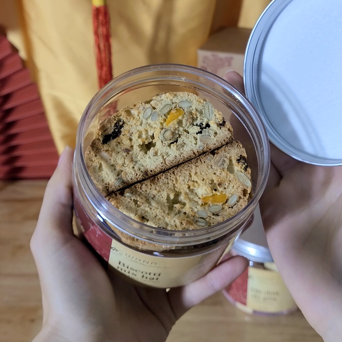 Hương vị Biscotti dễ ăn, có độ giòn cùng vị bùi, béo tự nhiên từ các loại hạt. Kết hợp cùng vị ngọt ngọt chua chua từ nho khô và xoài sấy dẻo, đem lại 1 hương vị thơm ngon khó cưỡng.
