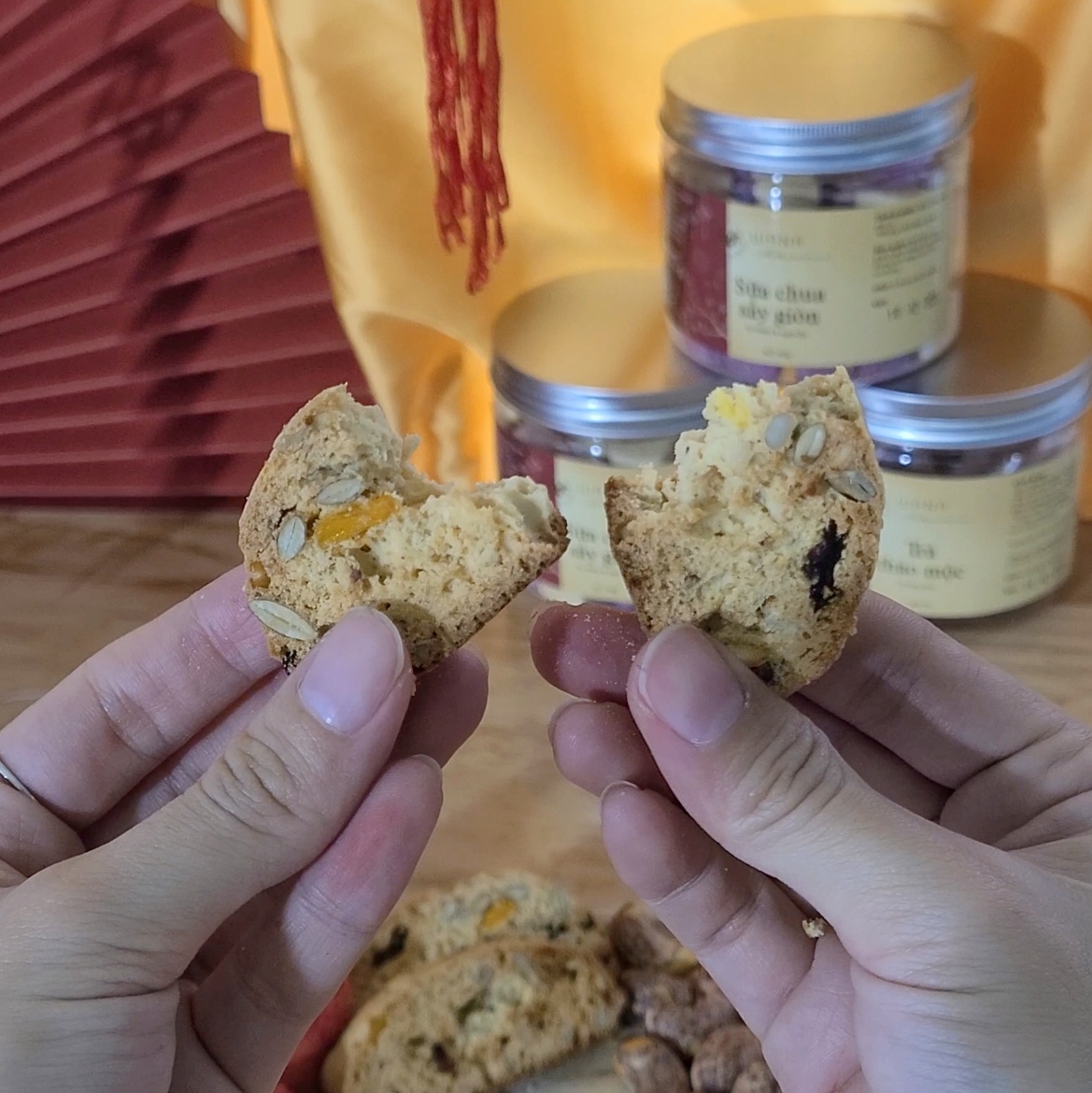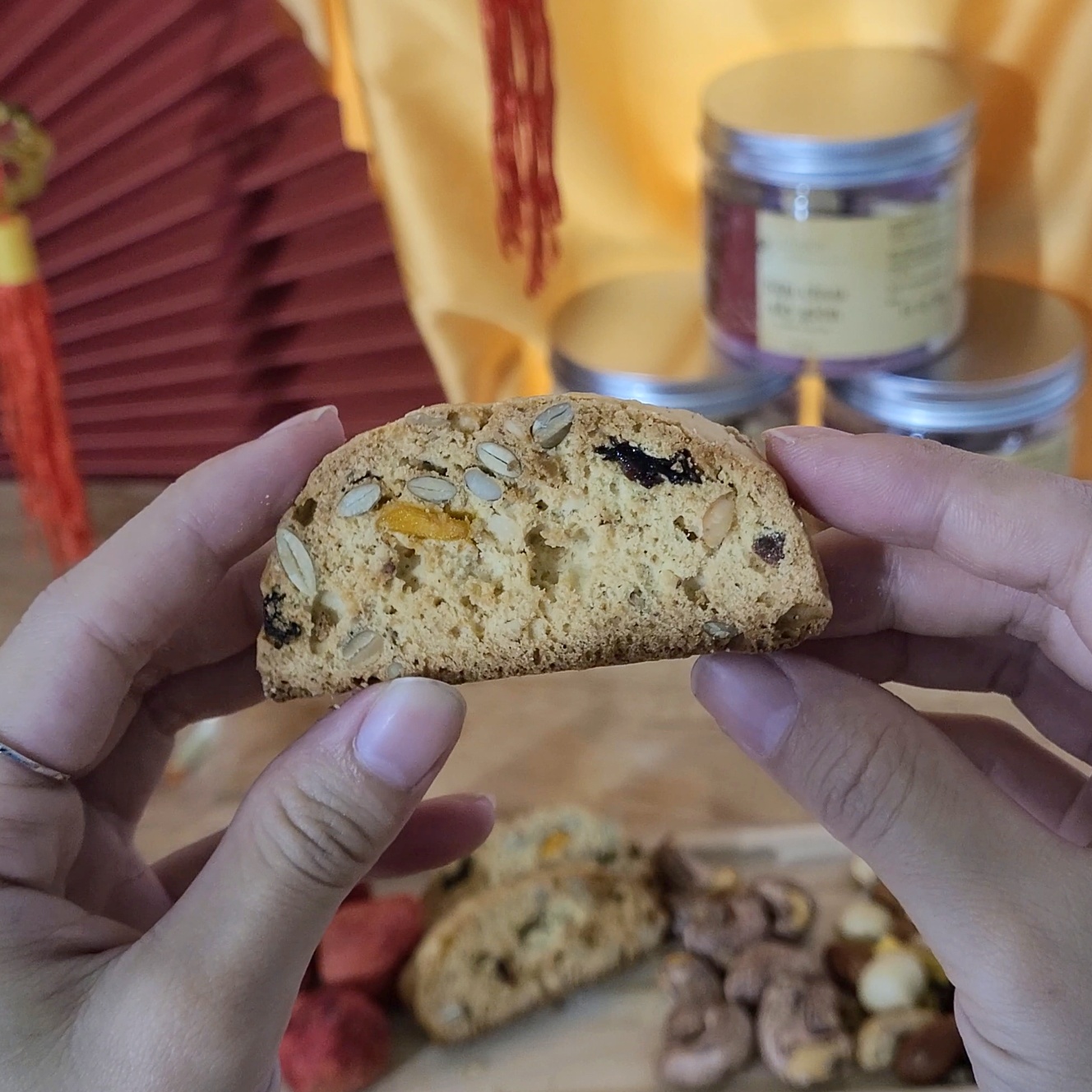 🍀Thành phần: Bột mì, bột yến mạch, hạt điều, hạt hạnh nhân, hạt bí xanh, hạt hướng dương, nho khô, xoài sấy dẻo, đường thốt nốt, bơ lạt. muối, vanilla, quế, bột nở.