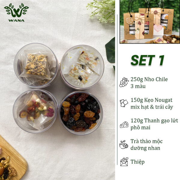 📍 Set 1: Nho Chile 3 màu, Trà thảo mộc dưỡng nhan, Thanh gạo lứt phô mai, Kẹo Nougat đường ăn kiêng