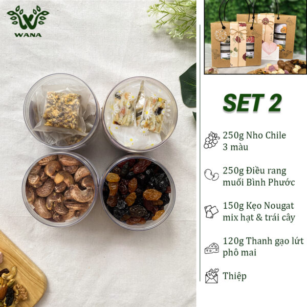 📍 Set 2: Nho Chile 3 màu, Điều rang muối Bình Phước loại A, Thanh gạo lứt phô mai, Kẹo Nougat đường ăn kiêng