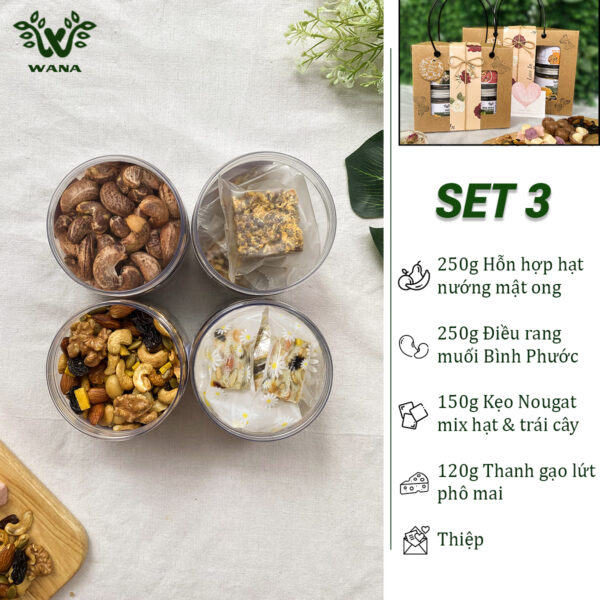 📍 Set 3: Hỗn hợp hạt nướng mật ong, Điều rang muối Bình Phước loại A, Thanh gạo lứt phô mai, Kẹo Nougat đường ăn kiêng