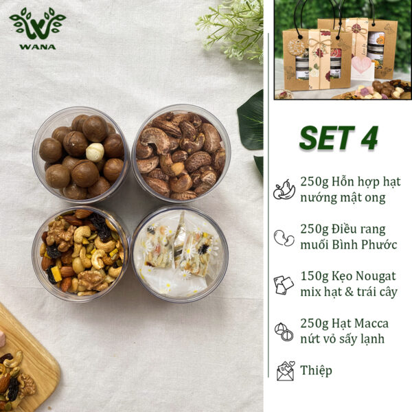 📍 Set 4: Hỗn hợp hạt nướng mật ong, Điều rang muối Bình Phước loại A, Hạt Macca, Kẹo Nougat đường ăn kiêng