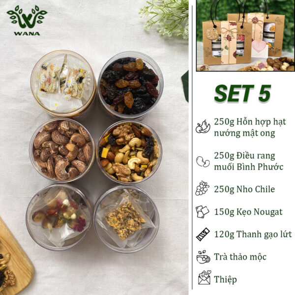 📍 Set 5: Hỗn hợp hạt nướng mật ong, Điều rang muối Bình Phước loại A, Kẹo Nougat đường ăn kiêng, Nho Chile 3 màu, Trà thảo mộc dưỡng nhan, Thanh gạo lứt phô mai