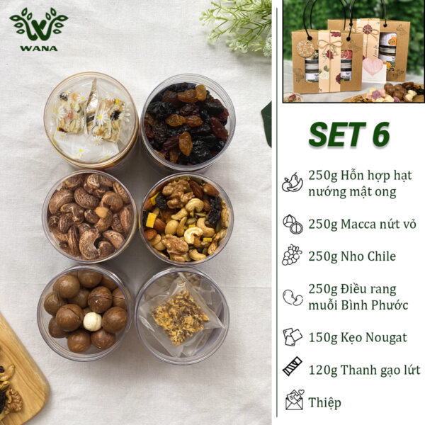 📍 Set 6: Hỗn hợp hạt nướng mật ong, Điều rang muối Bình Phước loại A, Kẹo Nougat đường ăn kiêng, Nho Chile 3 màu, Hạt Macca, Thanh gạo lứt phô mai