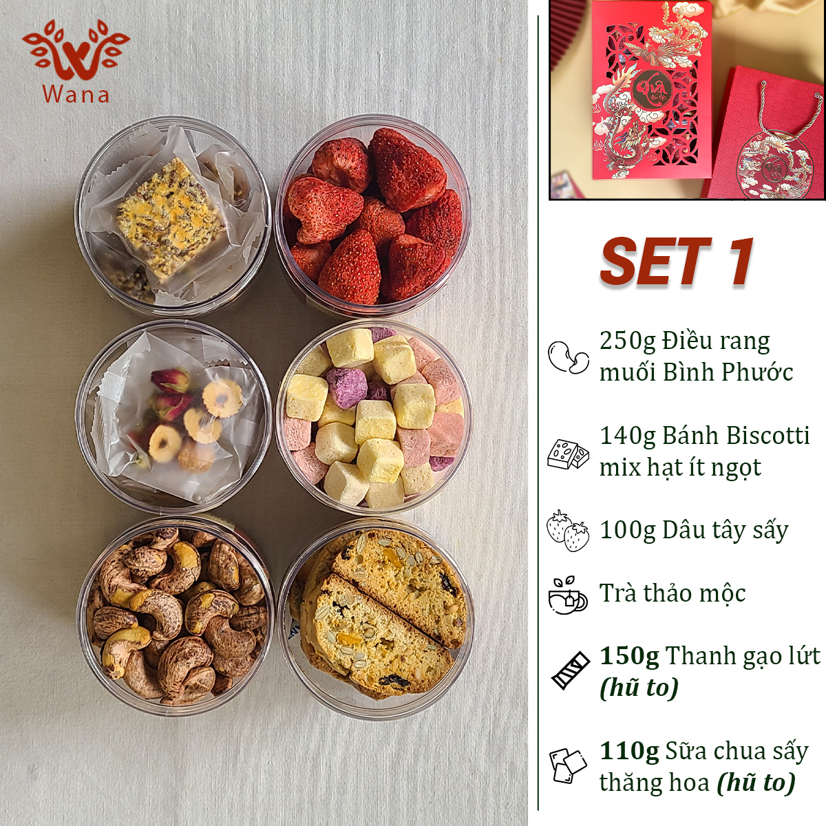 📍 Set 1: Bánh biscotti mix hạt, Điều rang muối Bình Phước, Dâu tây sấy, Sữa chua sấy, Thanh gạo lứt phô mai, Trà thảo mộc