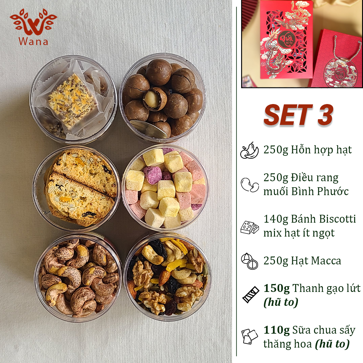 📍 Set 3: Hỗn hợp hạt nướng mật ong, Bánh biscotti mix hạt, Điều rang muối Bình Phước, Hạt macca sấy lạnh, Sữa chua sấy, Thanh gạo lứt phô mai